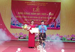 Lãnh đạo Đảng uỷ phường phát biểu chỉ đạo và tặng hoa chúc mừng nhà trường nhân dịp khai giảng năm học mới 2025 - 2026.